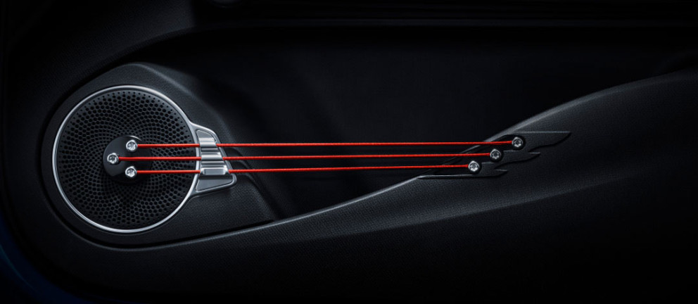 The unique strings combined with the speaker emulate a guitar-like design on the door panel. Relax and strum your playful 'guitar' to create your own melody. The flexible strings can also expand to hold bottles and more.